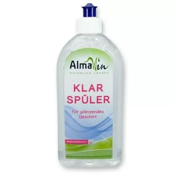 AlmaWin Öko mosogatógép öblítő koncentrátum, 500 ml. Természetes fekületaktív anyagai csökkentik a víz felületi feszültségét és biztosítják az optimális nedvesítést. Az edények cseppmentesen és gyorsan száradnak a hozzáadott alkohol és citromsav révén. Környezetbarát, biológiai úton különösen jól lebomlik.