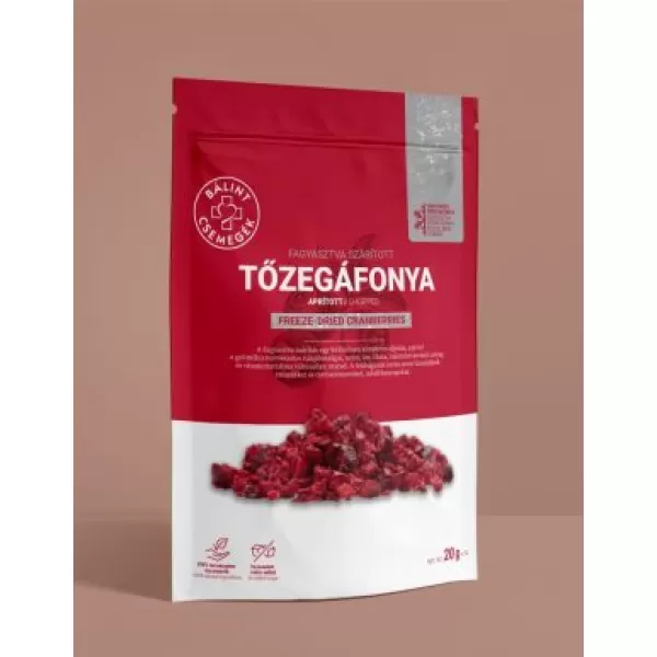 160g friss tőzegáfonya fagyasztva szárításával készül 20 g termék.