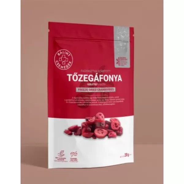 100 % apróra vágott amerikai tőzegáfonya gyümölcs (Vaccinium macrocarpon) fagyasztva szárított technológiával. 160g friss tőzegáfonya fagyasztva szárításával készül 20 g termék. Hozzáadott cukrot nem tartalmaz. Sót kizárólag nátrium természetes jelenlétéből adódóan tartalmaz.