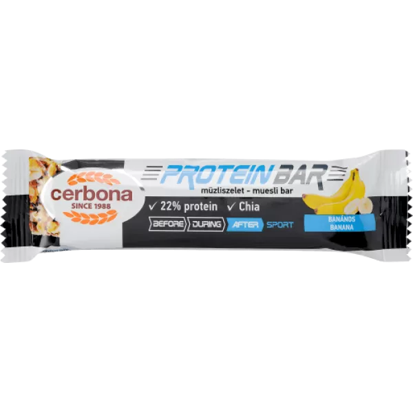 A Cerbona protein banános müzliszelet 35 g-os kiszerelésben kapható, amely chia maggal készül. Ez a fehérjében gazdag müzliszelet 22% proteintartalmú, kizárólag növényi eredetű fehérjéből készült. A fehérje hozzájárul az izomtömeg fenntartásához és növekedéséhez, ezért a fogyasztása sportolás után ajánlott.