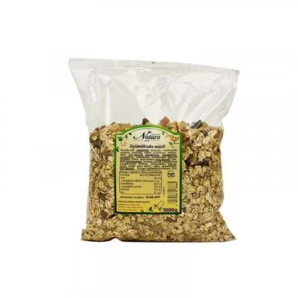 A NATURA müzlik nem tartalmaznak egyebet, mint az élelmiszeripar legegyszerűbb, de az eredeti koncepcióhoz tökéletesen odaillő komponenseit. Jelesül: a teljes értékű gabonák, emberi fogyasztásra egyszerűsített változatait, a gabonapelyheket. Ez képezi az alapot. Ehhez társul az olajos magvak népes családjának néhány képviselője is. A gyümölcsöket csak aszalvány, vagy szárítmány formájában tudjuk hozzáadni a hosszabb eltarthatóság okán. Déligyümölcsök, vagy a Távol-Keleti gyümölcsféleségek néhányát aprítva, szárítva használjuk, így a müzli átlagos gyümölcstartalma 30%.