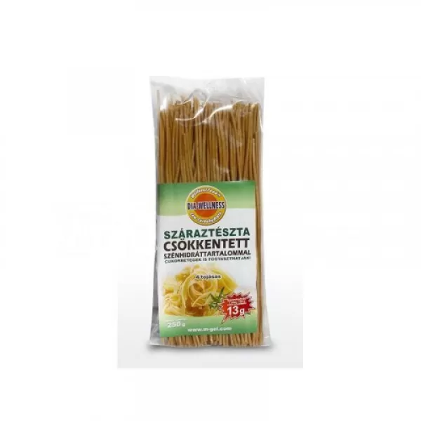 Dia-Wellness spagetti 250g kiszerelésben, amely kiváló választás a tudatos táplálkozóknak. Finom ízével és alacsonyabb szénhidráttartalmával ideális tésztaétel készítéséhez.