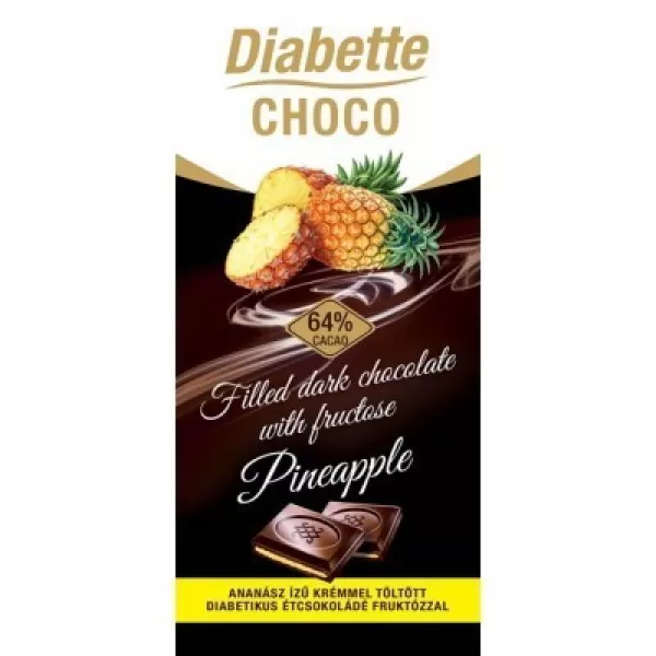 Termék leírása: A Diabette töltött étcsokoládé ananászzal egy különleges ízélményt kínál, amely ötvözi a gazdag étcsokoládé ízét a friss, zamatos ananász klasszikus ízével. Tökéletes választás mindazok számára, akik diétás vagy cukormentes alternatívát keresnek édességek fogyasztásához.