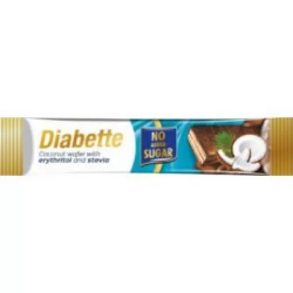 DIABETTE Kókuszos krémmel töltött ostya szelet, kakaós tejbevonó masszával mártva, hozzáadott cukor nélkül, édesítőszerekkel (eritrit és sztívia) 26g.