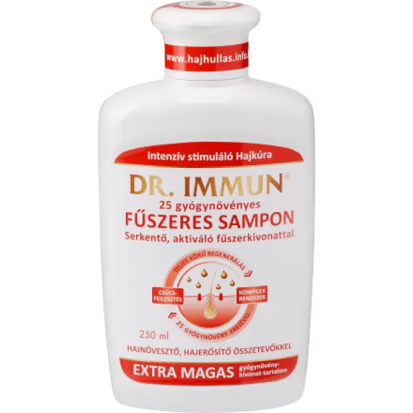 A Dr.Immun hajsampon 250 ml-es kiszerelésben kapható, amely 9 fűszeres hajnövesztő és regeneráló összetevővel rendelkezik. A fűszeres hajsampon serkentő, aktiváló fűszerkivonattal, hajnövesztő és regeneráló hatású. 9 stimuláló fűszer és 25 gyógynövény koncentrált kivonatát tartalmazza, amelyek intenzíven serkentik a hajnövekedést és táplálják a legyengült hajhagymákat.