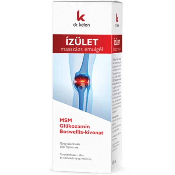 A Dr.Kelen Ízület emulgélt ízületi- és izomfájdalom esetén javasolt a bőrbe masszírozni. Meghatározó anyaga az MSM, Glükozamin és Boswellia-kivonat. Az ízületi fájdalom, gyulladás gyakran vezethető vissza túlzott izomfeszülésre, sport okozta túlterhelésre vagy porckopásra.