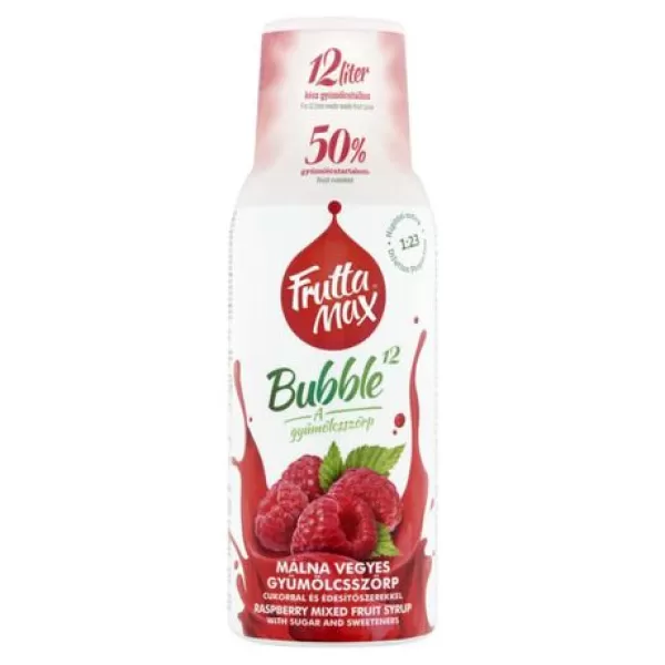 Frutta max gyümölcsszörp málna 500ml. Málna vegyes gyümölcsszörp, amely 12 liter kész gyümölcsitalhoz elegendő. Az ital izocukorral és édesítőszerrel készül, csökkentett energiatartalommal.