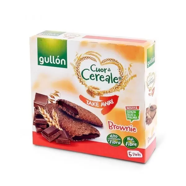 Brownie töltelékes szelet: brownie töltelék 42% (glükózszirup, nedvesítőszer (glicerin), kekszmorzsa (búzaliszt, szukróz, vaj, térfogatnövelő szerek (ammónium-hidrogén-karbonát), tejpor, só, savópor, savanyúságot szabályozó anyag (citromsav), természetes vanília aroma), csökkentett zsírtartalmú kakaópor, növényi olaj (napraforgó), cukor, stabilizátor (cellulóz), módosított keményítő, só, emulgeálószer (napraforgó lecitin), savanyúságot szabályozó anyag (tejsav), természetes aroma), gabonák 33% (teljes kiörlésű búzaliszt, árpaliszt, zabliszt, rozsliszt), magas olajsavtartalmú napraforgó olaj 9%, cukor, oligofruktóz, étcsokoládé 3% (cukor, kakaómassza, kakaóvaj, vízmentes tejzsír (tej), emulgeálószer (szójalecitin), természetes vanília aroma), csökkentett zsírtartalmú kakaópor, emulgeálószer (szójalecitin), aromák, térfogatnövelő szer (nátrium-hidrogén-karbonát), só.