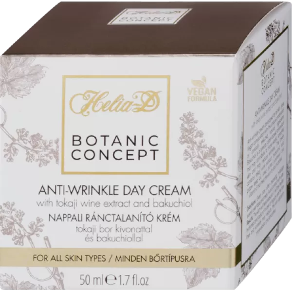A Helia-D botanic nappali ránctalanító krém tokaji bor kivonattal és bakuchiollal készült, amely segít a bőr hidratálásában és fiatalos megjelenésének megőrzésében.