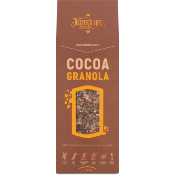 Hester's Granola Kakaós Gluténmentes 320g - A granola, más néven sült müzli, az Amerikai Egyesült Államokban a '60-as évek elején indult hódító útjára. Eredetileg Graham lisztből készült és tejjel fogyasztották. Idővel különböző gabonapelyhek kerültek a keverékbe, majd olajjal, mézzel ragasztották és sütötték össze az alkotókat.
