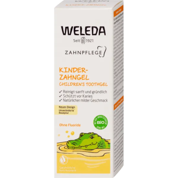Weleda zselés gyermek fogkrém 50mlTermészetes védelem a tejfogaknak: kellemes ízű, fluoridmentes gyermek fogkrém. mely gyengéden és hatékonyan tisztít és segít megelőzni a lepedék képződését!Ízében, színében és állagában is megfelel a gyermekek ízlésének és ezzel együtt kellemessé teszi a napi fogápolást gyermekeknek és szülőknek egyaránt. A körömvirág-kivonat az ínyek egészségéért felel, a kellemes ízről pedig a természetes illóolajok gondoskodnak. A gyengéd összetétel nem tartalmaz olyan anyagot, melynek lenyelése káros lenne a gyermek számára, ezen kívül nem tartalmaz fluoridot, cukrot, szintetikus édesítőszereket és színezékeket sem.Használata:A zselés gyermek fogkrémet nyomjuk a nedves fogkefére. Fogmosás után alaposan öblítsük ki a szájat és a fogkefét.Összetevők:Glycerin, Water (Aqua), Silica, Algin, Calendula Officinalis Flower Extract, Prunus Amygdalus Dulcis (Sweet Almond) Oil, Esculin, Flavor (Aroma)*, Limonene*. * természetes olajokból származó.