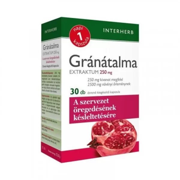 Az Interherb napi 1 gránátalma extraktum kapszula 30 darabos kiszerelésben kapható. Ez a táplálékkiegészítő gazdag antioxidánsokban, amelyek segítik a szervezet védelmét a szabadgyökök ellen.