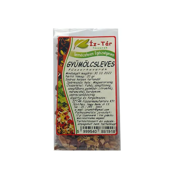 Az Íz-Tár fűszerek gyümölcsleveshez készült 20 g-os csomagolásban kapható. Ez a fűszerkeverék kiváló ízt és aromát biztosít a gyümölcsleveseknek, gazdagítva az ízélményt.