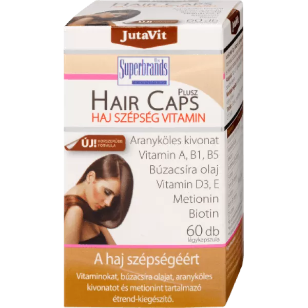 Haj szépség kapszula, mely tartalmaz aranyköles kivonatot, búzacsíra olajat, B1 és B5 vitamint, biotint és metionint.