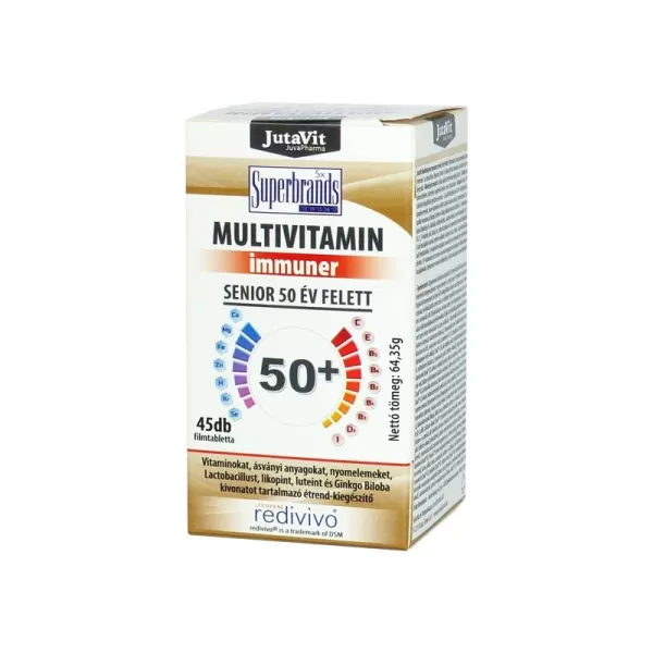 A JutaVit Multivitamin 50 év felettieknek olyan komplex termék, amely vitaminok mellett számos ásványi anyagot, nyomelemet és hozzáadott lactobacillus probiotikumot tartalmaz.