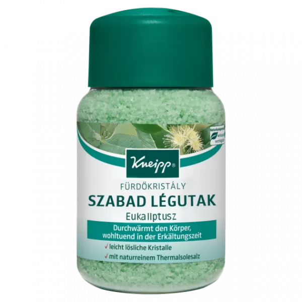 A Kneipp Szabad légutak Fürdőkristály természetes termálsóból készül és értékes eukaliptusz illóolajat tartalmaz. A Kneipp fürdőkristályok tiszta termálsóját az Európában egyedülálló Saline Luisenhall természetes sókészletéből nyerik évszázados hagyományokat követve. A sókristályokat értékes aromaaktív olajokkal vonják be.