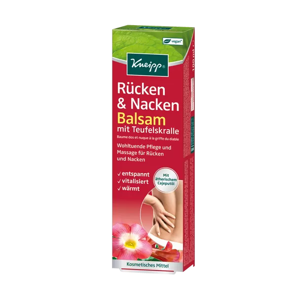 A Kneipp® hát- és nyakbalzsam értékes varjúköröm-kivonatot, természetes cajeput illóolajat és más illóolajok illatos kombinációját tartalmazza. A kiváló minőségű sheavajat, hidratáló mandulaolajat és tápláló napraforgóolajat tartalmazó gazdag formula könnyen eloszlatható, és masszázshoz való használatra is alkalmas. A balzsam masszázzsal kombinálva serkentheti a vérkeringést és kellemes melegítő hatást fejthet ki, így ellazítja és megnyugtatja a hát és a nyak igénybe vett izmait.