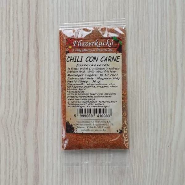 Füstölt édes paprika, Holy Trinity chili keverék, Fűszerpaprika, Cayennebors, Római kömény őrölt, Oregano, Koriander őrölt, Feketebors őrölt, Vöröshagyma granulátum, Babér őrölt, Fokhagyma granulátum