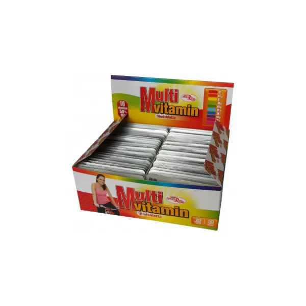 Multivitamin tabletta édesítőszerrel, filmbevonattal. 10 féle vitamint tartalmazó étrend kiegészítő tabletta