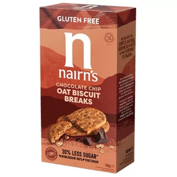 -5% Nairns Gluténmentes teljeskiőrlésű 56% rostdús zabkeksz csoki chips 160 g