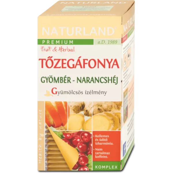 Naturland gyümölcstea tőzegáfonya-gyömbér narancshéj 20x2g, összesen 40 g.