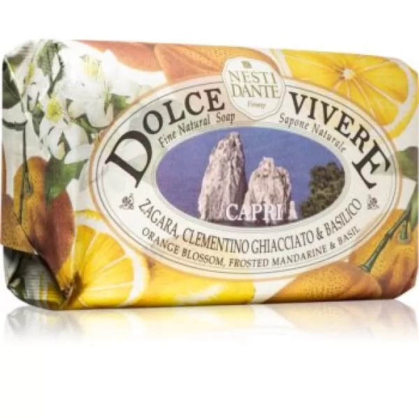 A Nesti Dante Dolce Vivere Capri természetes szappan frissítő, üde illata a mediterrán Capri szigetére emlékeztet. Természetes alapanyagokból készült, tradicionális módon, így igazán luxusos minőségű. Könnyen habzó textúrája tisztítja a bőrt, és kellemes, citrusos illatot hagy maga után.