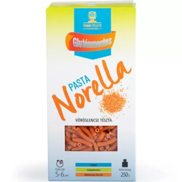 Pasta Norella gluténmentes, vöröslencselisztből készült száraztészta. Élelmi rostban gazdag, tojás- és szójamentes. Száraz helyen tárolandó.