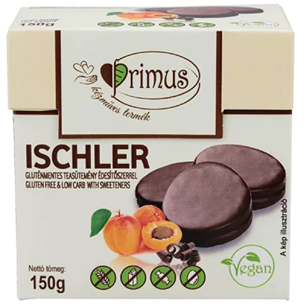 A Primus ischler baracklekvárral töltött, kakaós étbevonóba mártott vegán apró teasütemény, csökkentett szénhidrát tartalommal. Az újragondolt ischlerben az íz és az omlós tészta a régi, az összetevők viszont úgy lettek válogatva, hogy azok glutén-, tej-, laktóz-, tojás-, színezék- és tartósítószer mentesek legyenek. Tökéletes édesség összetett ételérzékenyek és vegánok számára, de számos más étrendbe is beilleszthető. A termék a speciális étkezési célcsoport számára megfelelő alternatíva, vegánsága mellett, gluténmentes, cukormentes, tejmentes, tojásmentes, szénhidrátcsökkentett, IR kompatibilis.