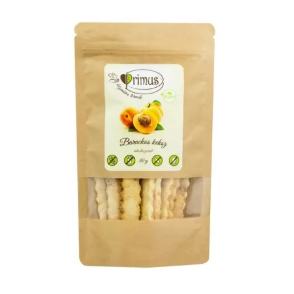 Primus keksz barackos 80gPrémium minőségű, glutén, tej, cukor, tojás, tartósítószer és adalék mentes, paleo kézműves keksz. Finom és ropogós snack!