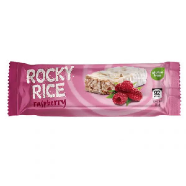 Rocky Rice puffasztott rizsszelet, ízletes fehér csokoládéval és málna ízű élménnyel. A termék gluténmentes és ideális választás málnás édességet keresőknek.