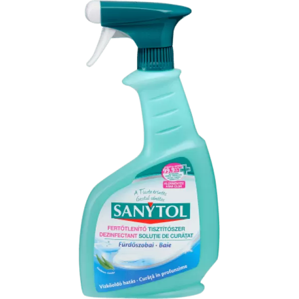 A klórmentes Sanytol fürdőszobai tisztítószer tökéletes higiéniát biztosít és 99,9%-ban elpusztítja a mikroorganizmusokat. Extra erős tisztító hatásának köszönhetően könnyedén eltávolítja a vízkő- és szappanlerakódásokat.