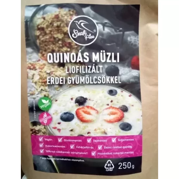 Felhasználási javaslat: A Szafi Free quinoás müzli liofilizált erdei gyümölcsökkel kiválóan alkalmas egy kiegyensúlyozott, gluténmentes reggeli részeként. Növényi tejhelyettesítővel, friss gyümölcsökkel, joghurttal, pudinggal vagy kásával fogyasztható.