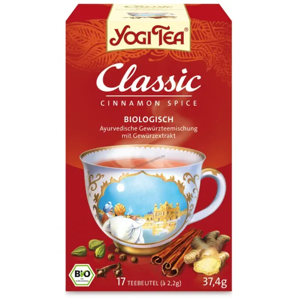 Yogi bio classic fahéjas tea 17 filterA Klasszikus tea receptje több ezer évre nyúlik vissza. A keleti kultúra ősi hagyományait, lelki gyakorlatait eleveníti fel. A fahéj aromája meghitt hangulatot teremt. Karácsony közeledtével ünnepi atmoszférát varázsol jellegzetes illatával. Hideg téli napokon különösen kellemes ital melegen fogyasztva.A fahéj fertőtlenítő, antibakteriális tulajdonságú, így a Yogi fahéjas tea az immunrendszert is védi a hideg évszakokban.Elkészítés: a teafiltert frissen forralt vízben kell áztatni legalább 5-8 percig, vagy erősebb íz eléréséhez még tovább.Összetevők: fahéj (61%), kardamom, gyömbér, szegfűszeg, fekete bors, fahéjkivonat (természetes aroma), gyömbérolaj.Az összetevők ellenőrzött ökológiai gazdálkodásból származnak.