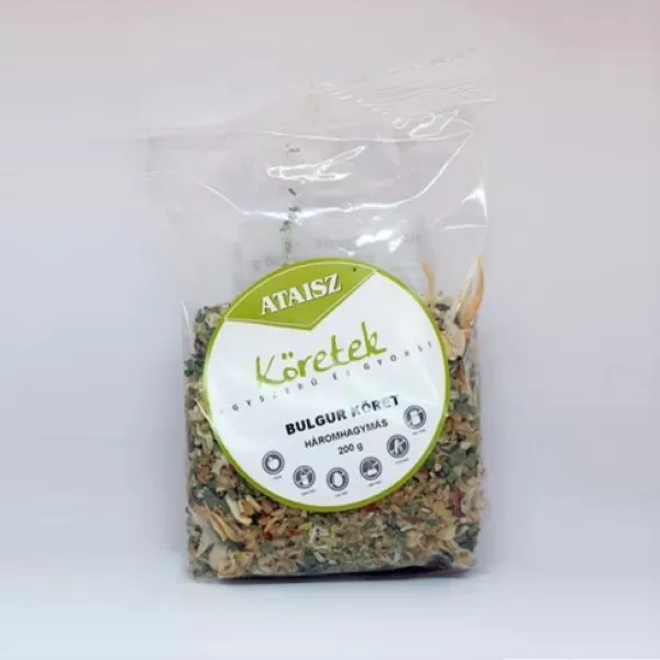 Bulgur (búzatöret) (Törökország), szárított zöldségek (snidling, póré- és vöröshagyma, paradicsompehely (Kína)).