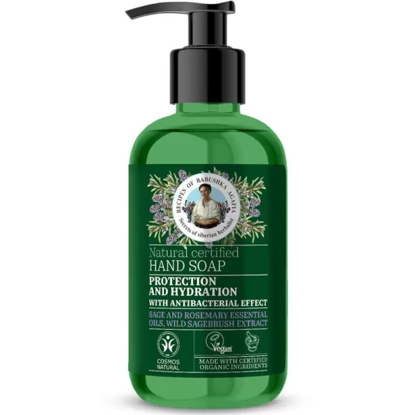 A Babushka Agafia bio védő és hidratáló folyékony szappan zsálya, rozmaring illóolaj és zsályacserje kivonattal készült, és ideális választás a bőr kíméletes tisztítására és ápolására.