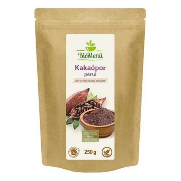 A Bio Menü Bio Perui Kakaópor egy igazi csoda az egészség számára. Az antioxidánsokban gazdag perui kakaópor hozzájárul a szív egészségéhez és védelméhez. A dél-amerikai theobroma cacao fa, melyet a maják és aztékok is tiszteltek, számos jótékony hatással bír. A kakaópor gyártása során megőrzött antioxidáns tartalom sokszorosan felülmúlja a vörösborét, és szinte háromszorosa a zöld teának. Az ásványi anyagokban gazdag kakaópor egy forrása számos nélkülözhetetlen tápanyagnak.