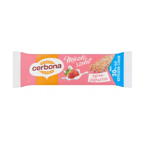 Kóstold meg a csökkentett cukortartalmú Cerbona Epres-joghurtos müzliszeletet, melyet a többfajta gabonapehely, eper- és málnadarabok teszik igazán ellenállhatatlanná. Cukor helyett maltitszirupot tartalmazó termékünk a fogyasztást követően kisebb mértékű vércukorszint-emelkedést okoz, mint a cukrot tartalmazó termék.
