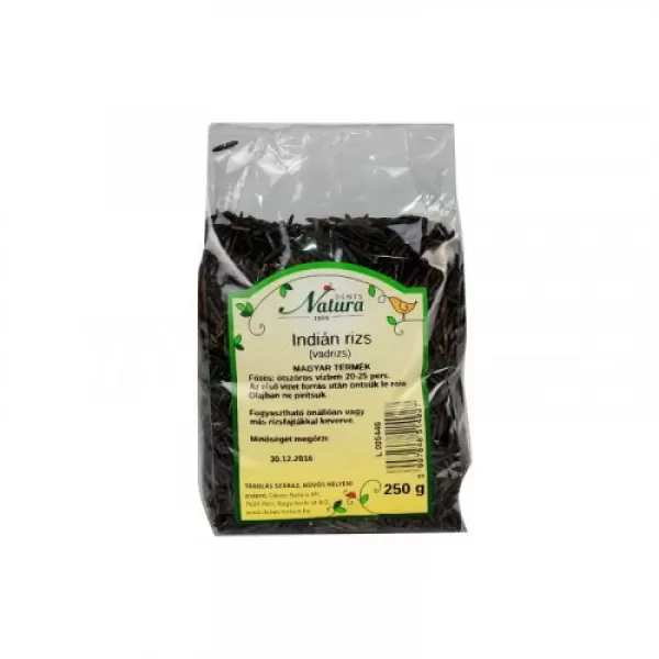 Natura Indián Rizs / Vadrizs / 250 gAz indián rizs ínyencek étele, a sima rizzsel szemben jóval több fehérjét, B1, B2 vitaminokat, PP faktort (nikotinsavamidot) és vasat tartalmaz.