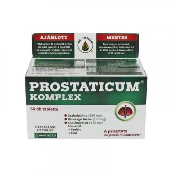A Prostaticum komplex tabletta a 45 év feletti férfiak számára javasolt készítmény a prosztata és a húgyúti rendszer megfelelő működésének támogatására. Főbb hatóanyagai a szabalpálma, kisvirágú füzike, csalángyökér, szelén és cink.