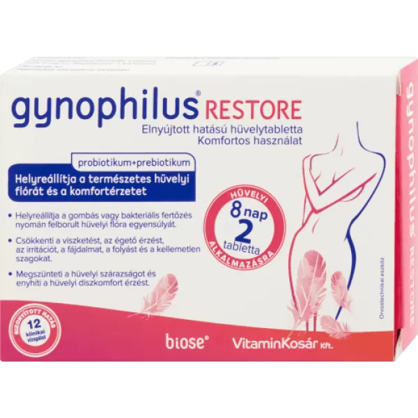 A Gynophilus® RESTORE az első elnyújtott hatású probiotikus hüvelytabletta, amely kényelmesebb alkalmazást biztosít. A tabletta a hüvelyi flóra helyreállítására szolgál gombás vagy bakteriális fertőzést követően, a hüvelyi szárazság megszüntetésére, és a viszketés, égető érzés, valamint kellemetlen szagok enyhítésére.