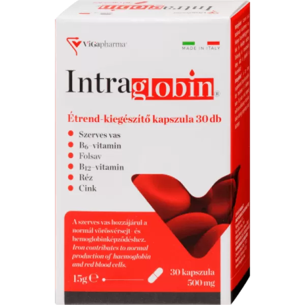 A Vigapharma Intraglobin kapszula egy szerves vasat tartalmazó étrend-kiegészítő, amely vashiányos 16 év feletti gyermekek és felnőttek számára ajánlott. Különösen hasznos terhesség és menstruáció idején a normál vörösvérsejt- és hemoglobinképződés támogatására.
