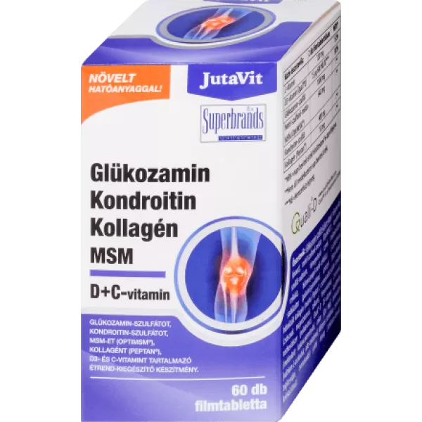 Glükozamin-szulfátot, kondroitin-szulfátot, MSM-et (OptiMSM®), kollagént (Peptan®), D3- és C-vitamint tartalmazó étrend-kiegészítő készítmény!