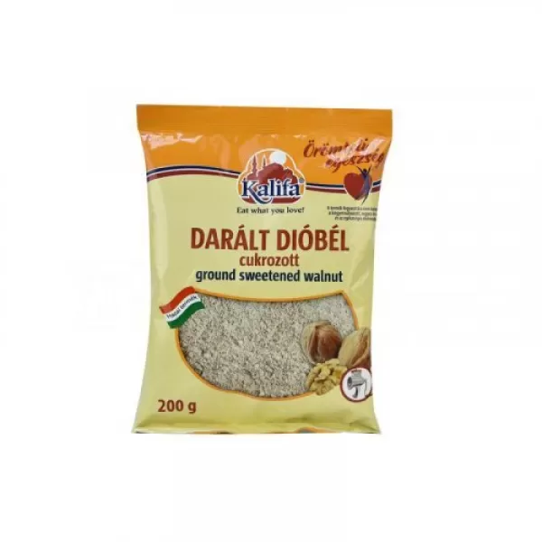 Kalifa darált cukrozott dió 200gA dió az egyik legértékesebb csonthéjas gyümölcs, az egészség jelképe, hiszen bőségesen tartalmaz zsírsavat, fehérjét, ásványi anyagokat és vitaminokat. Magas fehérje tartalma miatt a vegetáriánusok sok olyan tápanyaghoz juthatnak, amelyeket az ember hagyományosan csak állati táplálékokból vehet fel. Ásványi anyagok közül kiemelten magas a kalcium, kálium, magnézium, foszfor, cink, mangán tartalma. Vitaminokból főként B1-, B2-, E és C-vitamin tartalma jelentős. Ezen kívül fogyasztása csökkenti a vér koleszterinszintjét.A Kalifa darált, cukrozott dió jelentősen megkönnyíti a háziasszonyok dolgát a konyhában, hiszen szinte azonnal felhasználható tészták, sütemények ízesítőjeként.ÖSSZETEVŐK: Darált dióbél, cukorliszt 40% (cukor, burgonyakeményítő) (Régen tartalmazott a cukrozott dió és a törökmogyoró is glutént, mert a cukorliszt búzakeményítővel készült. A cukorlisztet most burgonyakeményítővel készítik ezért nem allergén.