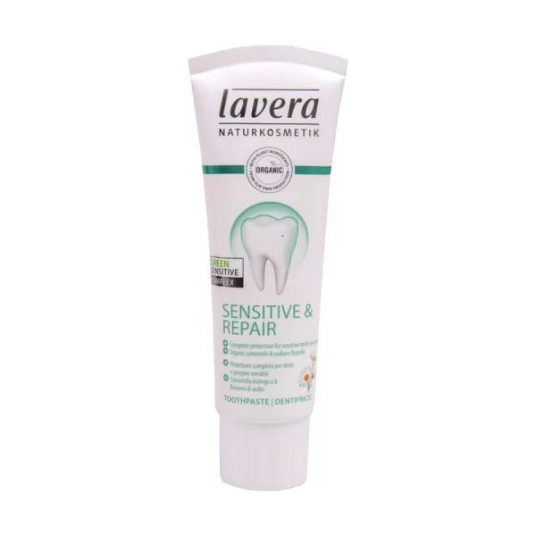 Lavera Basis SENSITIVE & REPAIR FOGKRÉM bio kamillával és szódium-fluoriddal, új GREEN SENSITIVE COMPLEX formula aktív összetevőkkel. Ez a fogkrém teljeskörű védelmet nyújt az érzékeny fogak és a fogíny számára.