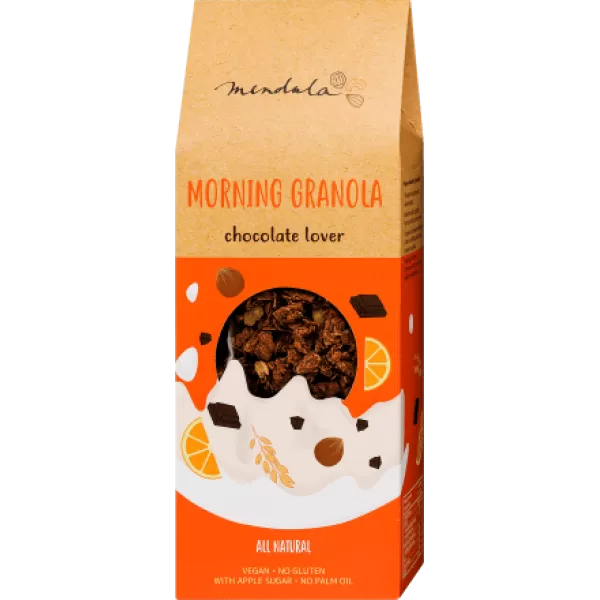 Mert a csokit (majdnem) mindenki szereti. A kakaós granola alaphoz 70%-os kakaótartalmú belga étcsokoládé cseppeket, bio kandírozott narancshéjat, és enyhén pirított, egész törökmogyoró szemeket adtunk. Simán elmegy édességnek is, így ha rád tör a nassolhatnék, mindig legyen a kezed ügyében egy csomaggal!