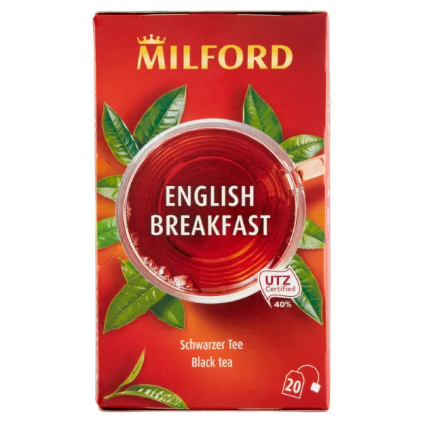 Milford fekete tea English Breakfast ízű, 20 db 1,75 g-os filtert tartalmazó csomagban.