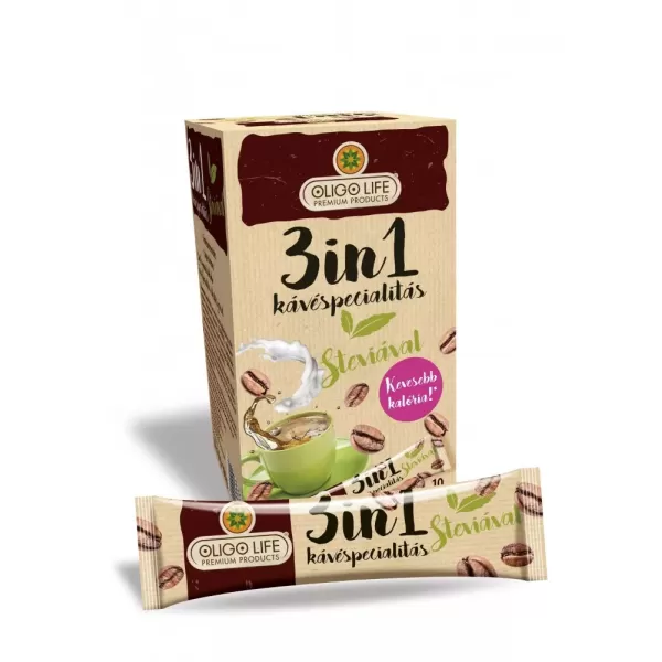 kávéfehérítő por növényi zsírral (glükózszirup, teljes mértékben hidrogénezett kókuszzsír, TEJFEHÉRJE, stabilizátor: kálium-foszfátok; emulgeálószer: zsírsavak mono- és digliceridjei; színezék: karotinok), instant kávé (19%), csomósodást gátló anyag (szilícium-dioxid), édesítőszer (szteviol-glikozidok). Stevia