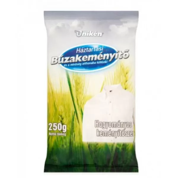 Háztartási búzakeményítő (Búzakeményítő 86-88%, por) Felhasználható: A búzakeményítő búzalisztből kivont keményítő, mely alkalmas technikai és élelmiszeripari felhasználásra. Alkalmazás és adagolás: Ruhakeményítő szer. 3-4 evőkanálnyi (4-5 dkg) keményítőt egy deciliter hideg vízzel csomómentesen elkeverünk, majd folyamatos keverés közben 2 liter forrásban lévő vízbe öntjük. Egy percen át kevergetjük, és az így kapott főzetet felhígítjuk annyira, hogy az oldat a keményítendő ruhát ellepje. Tárolás: Száraz, hűvös (20°C alatti) helyen tároljuk.