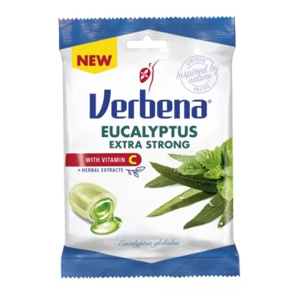 A Verbena Eukaliptusz Extra Strong töltött keménycukorka eukaliptusz olajat, mentolt és borsmenta kivonatot is tartalmaz, melyeknek köszönhetően íze még mentolosabb és még frissítőbb.